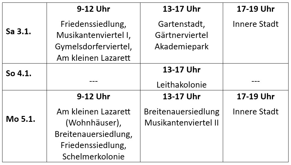 Wir wollen gerne alle Menschen unseres Pfarrgebietes, die die Sternsinger aufnehmen möchten, besuchen. Heuer werden wir an bestimmten Tagen in den jeweiligen Gebieten der Pfarre unterwegs sein.
